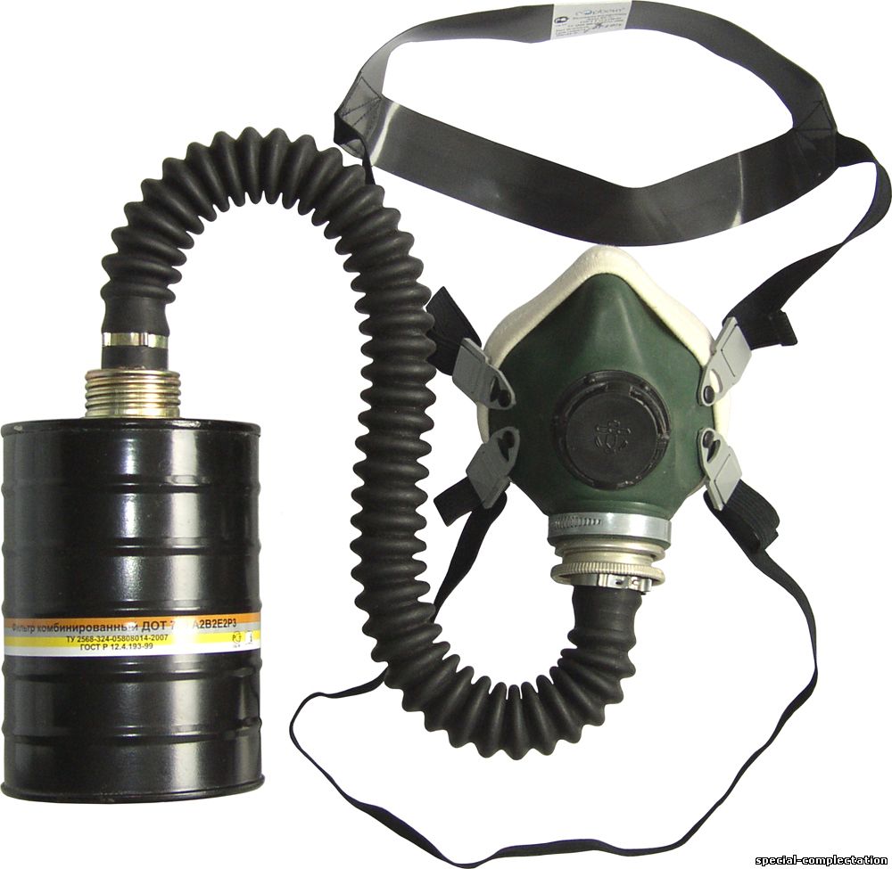 Состав. Противогаз «Металлург» состоит из комбинированного фильтра ДОТ 780 марки А2В2Е2Р3, полумаски изолирующей «Кама ПР-7», соединительной трубки и сумки для хранения и ношения противогаза.